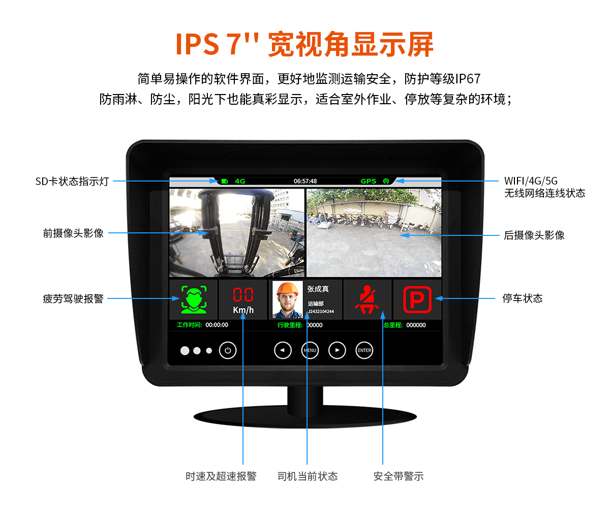 7寸高清显示屏、DMS驾驶员摄像头、前后行人防撞摄像头、防撞主机、声光报警器、主线材、无线传感器、继电器