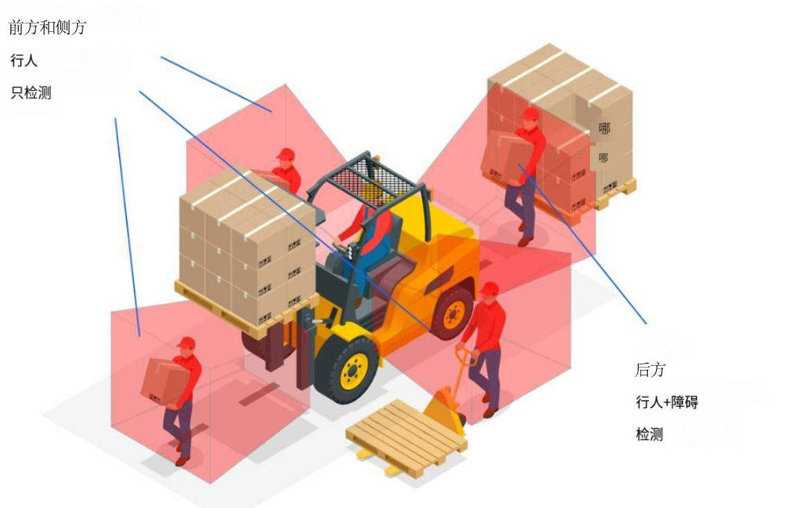 叉车主动防撞系统主要采用激光雷达、超声波、红外感应等传感器来探测周围环境,对叉车周围的障碍物和其他车辆进行实时监测。当叉车接近障碍物或其他车辆时,系统会自动发出警报,防止叉车撞上障碍物或其他车辆。在一些高端的叉车主动防撞系统中,还可以实现自动制动和自动避障功能,无需人工干预,使得驾驶员更为安全和便捷地进行操作。