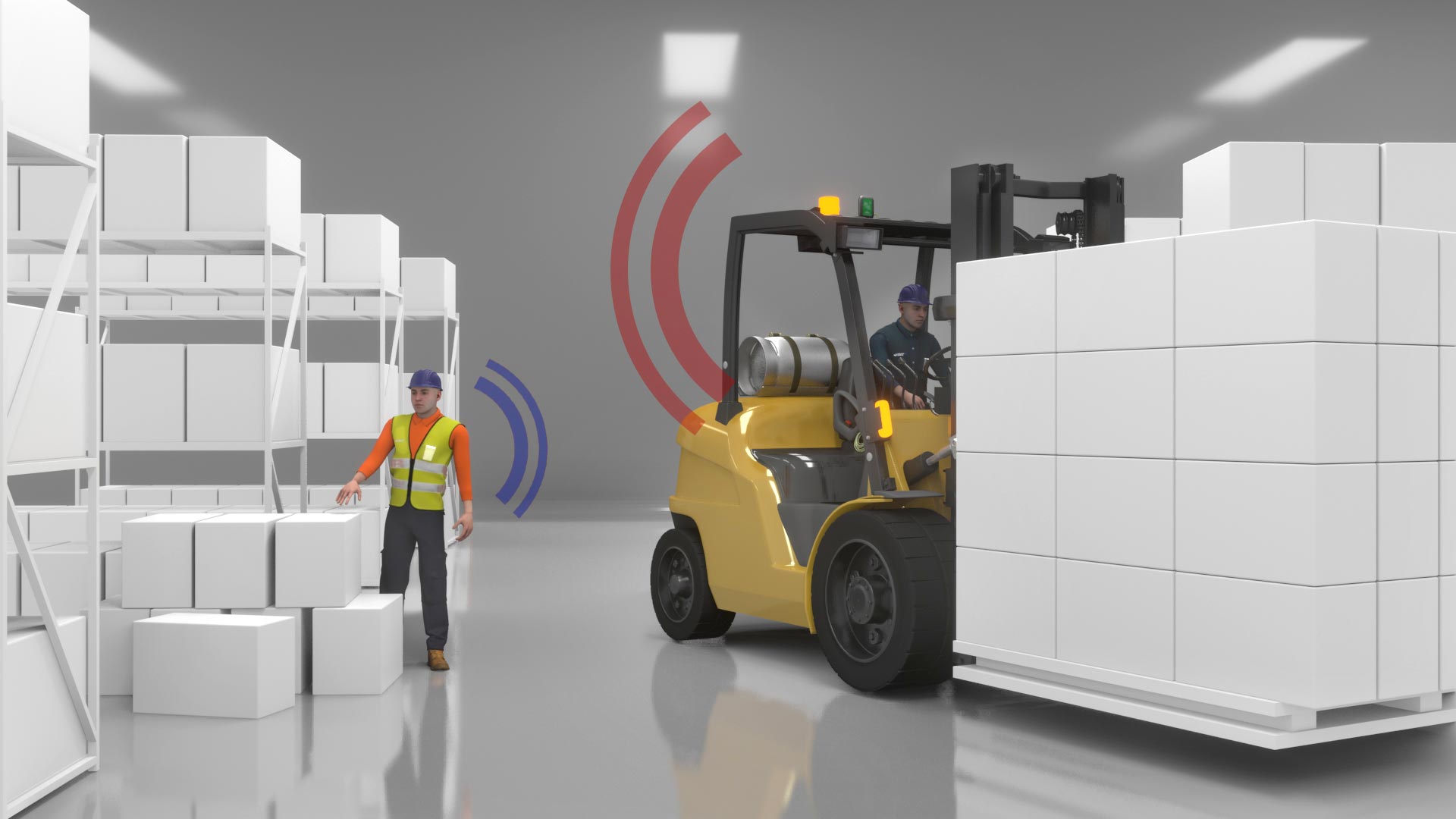 当系统检测到有行人靠近叉车的运动路径时,它会立即向叉车的驾驶员发出警报,并显示所处位置和距离。此类反应的反应时间非常短,因此系统可以帮助叉车驾驶员及时减速或避让,以确保行人的安全。